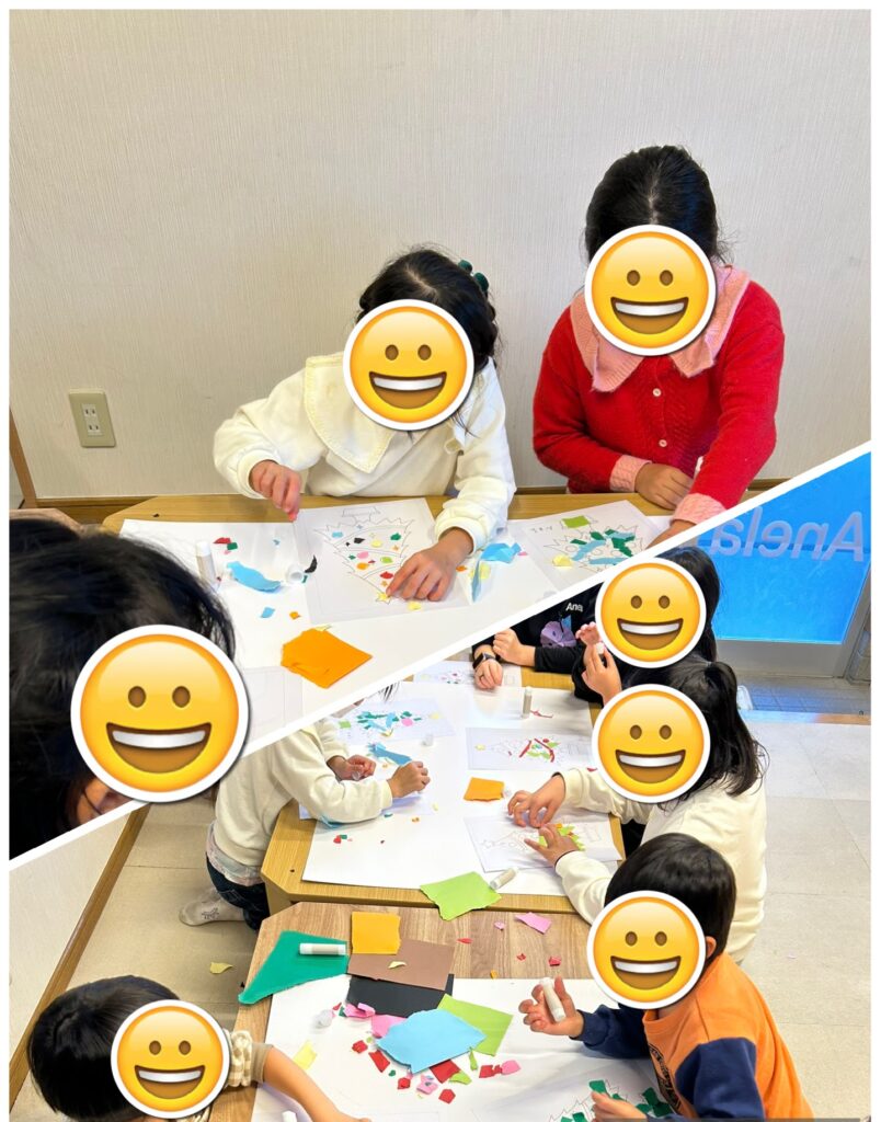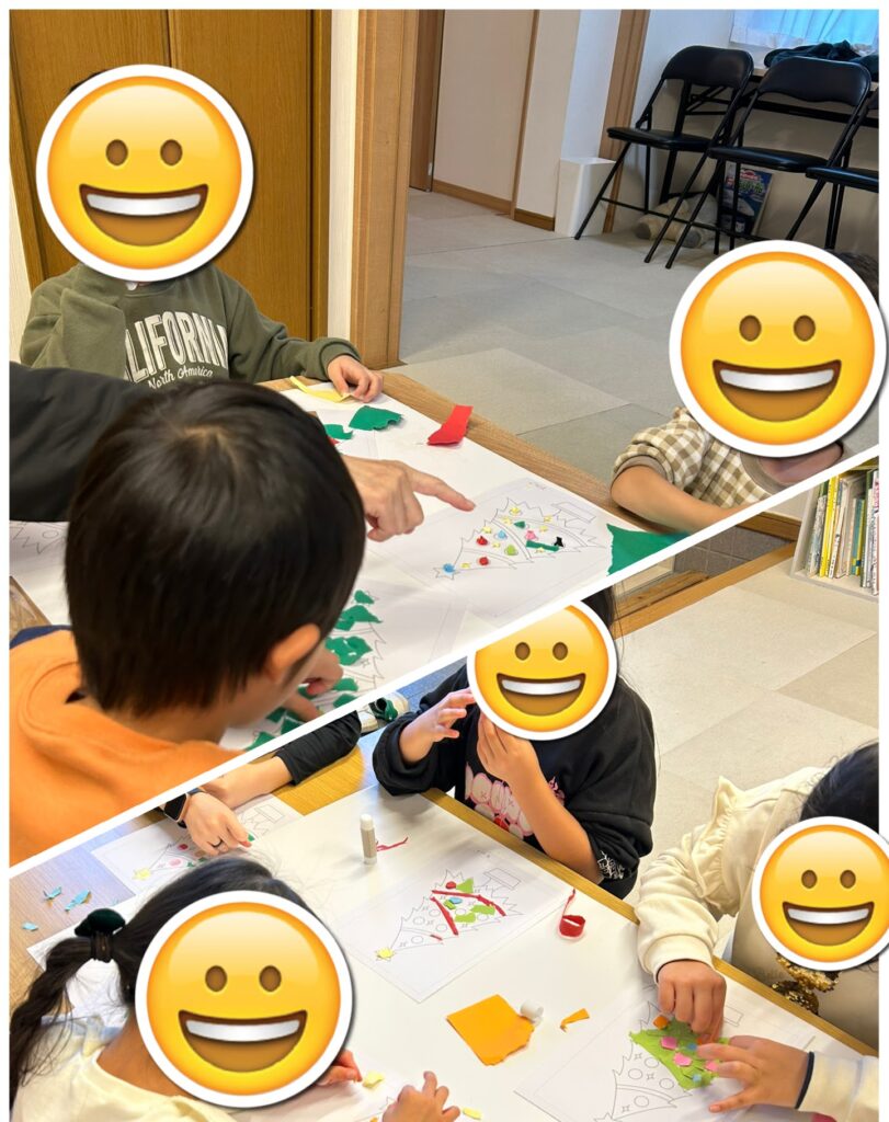 細かく千切ってはみ出さないように貼る子や大胆に色付けする子、飾り付け部分を立体的に見せようとする子など個性が溢れていて、見守っていて楽しくなりました