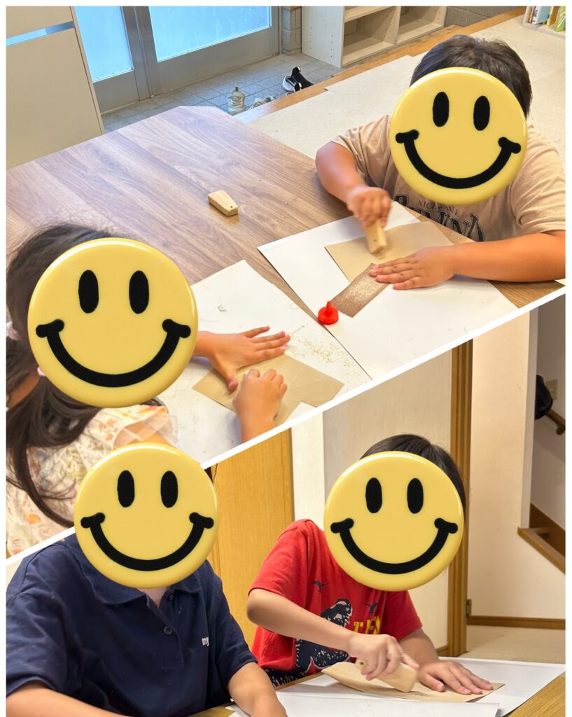 「視覚」は木の形や木目などを目で見ること、「聴覚」は木がぶつかり合う音(拍子木のようイメージ)を聴くこと、「嗅覚」は木そのものの匂いや香りをつけその匂いを感じること、「触覚」はヤスリをかける前と後での手触りの違いに気付くことなどを通じて楽しく制作してくれることを目的としています