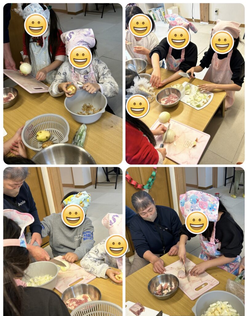 子どもたちが一生懸命に包丁等を使って食材を切り、炒めたり、煮込んでいきます