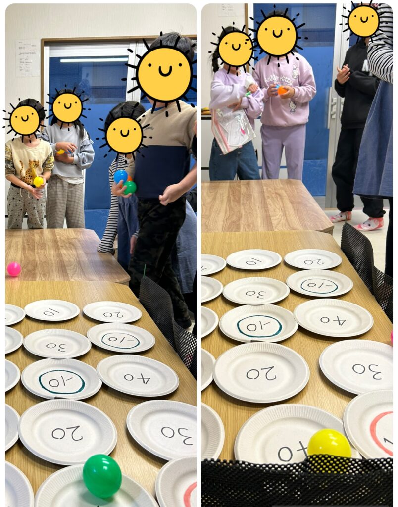 紙皿に得点を書き、ボールを転がして紙皿に乗った得点を競います