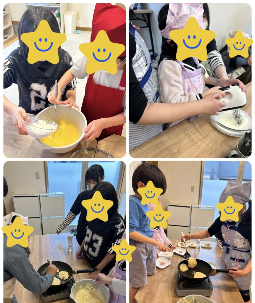 運動をしてお腹が空いた後は、おやつに「スフレパンケーキ」を作りました