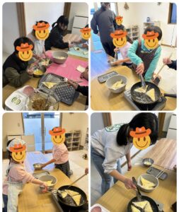 本日のおやつは「カレーパン」 食パンを薄く伸ばしてカレーを入れて三角に折ります 卵とパン粉をつけて、フライパンできつね色になるまで揚げて完成 美味しく出来上がり、子どもたちに好評でした
