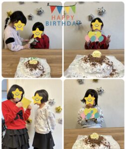 1月のバースデーパーティーを開催しました 今回はチョコレートケーキを作りました チョコベースのスポンジケーキにホイップしたクリームを塗り、チョコをふりかけました ケーキが完成するとメッセージカードをプレゼントし、みんなで […]