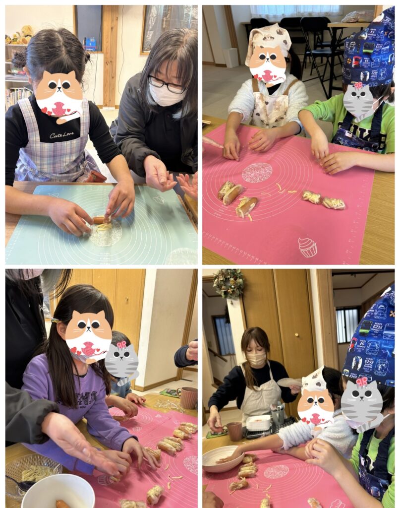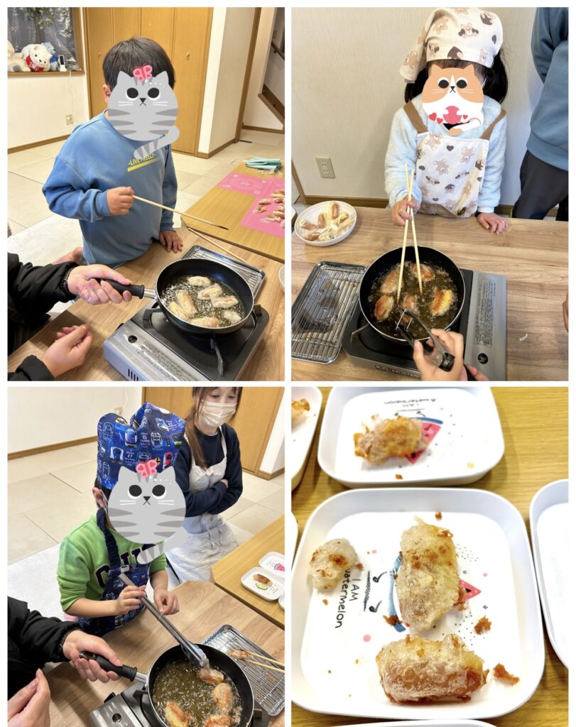 おやつ作り(パリパリソーセージ) 2026年1月16日 最終更新日時 : 2026年1月21日 アネラスタッフ ライスペーパーにウインナーとチーズをのせて包みます 包んだら、油で揚げて完成 お手軽に作れて子どもたちの満足度が高い一品です